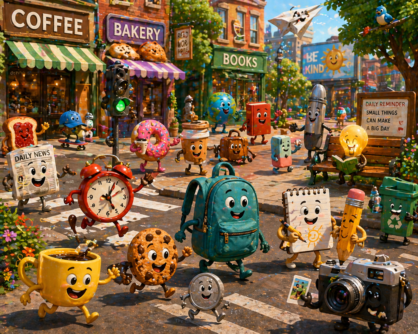 A hyper-detailed cartoon-style world where everyday objects are alive, interacting naturally, with consistent character design and vibrant colors.